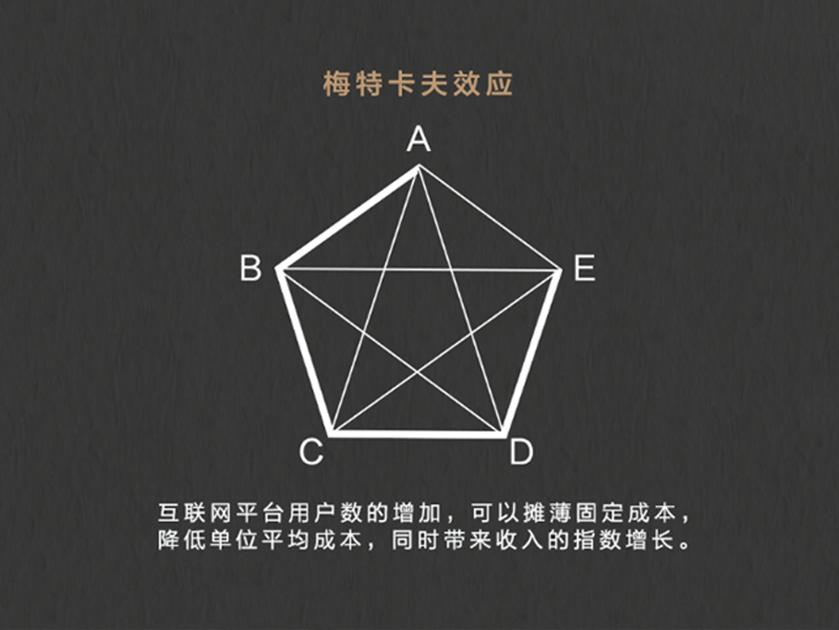 第一,梅特卡夫效应。梅特卡夫是一位成功的创业者,后来到学校教书,跨商学两界,他通过经验观察得出一个结论,被命名为梅特卡夫效应,指的是网络的价值随着节点数的增加呈指数级上升。