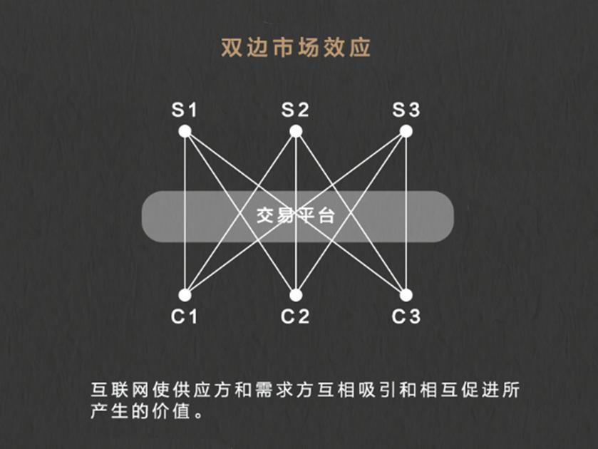 第二,双边市场效应。 双边市场效应,指的是供给方和需求方之间正反馈所创造的价值。其实非常简单,在菜市场就能看到双边市场效应,如果卖菜的多,买菜的就会越多;买菜的多了,卖菜的就会越多。